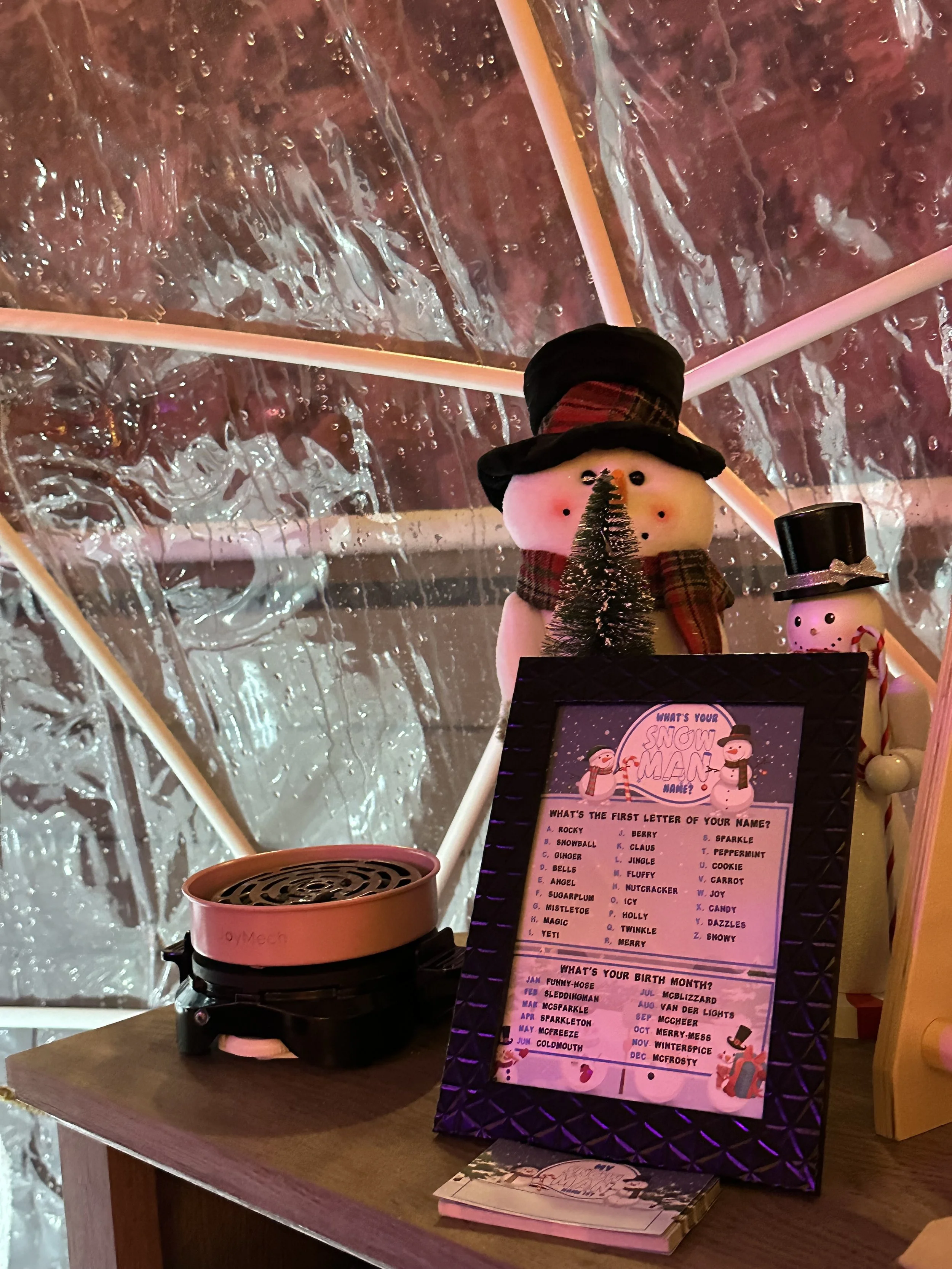 The igloo was fairly warm despite the recent snow but there were a couple of blankets available. There was a cute small couch, two comfortable chairs, and 3 smaller metal chairs. The door was able to be zipped so the heat stayed in. The cozy space also featured a skinny decorated Christmas tree, a small fireplace, several cute pillows, several games, a music speaker which we didn’t use because we could hear Christmas music playing outside, a table to put food and play games, plush snowballs for a snowball fight, and a few adorable snowman. You could either order food ahead of time or visit the Treetops Restaurant, the theater, and one other location and bring food back to the igloo. I had preordered a charcuterie board and a tray of cookies, plus a s’mores kit. If you needed drinks or something, you could press a button on the table and someone would come to your igloo and assist.