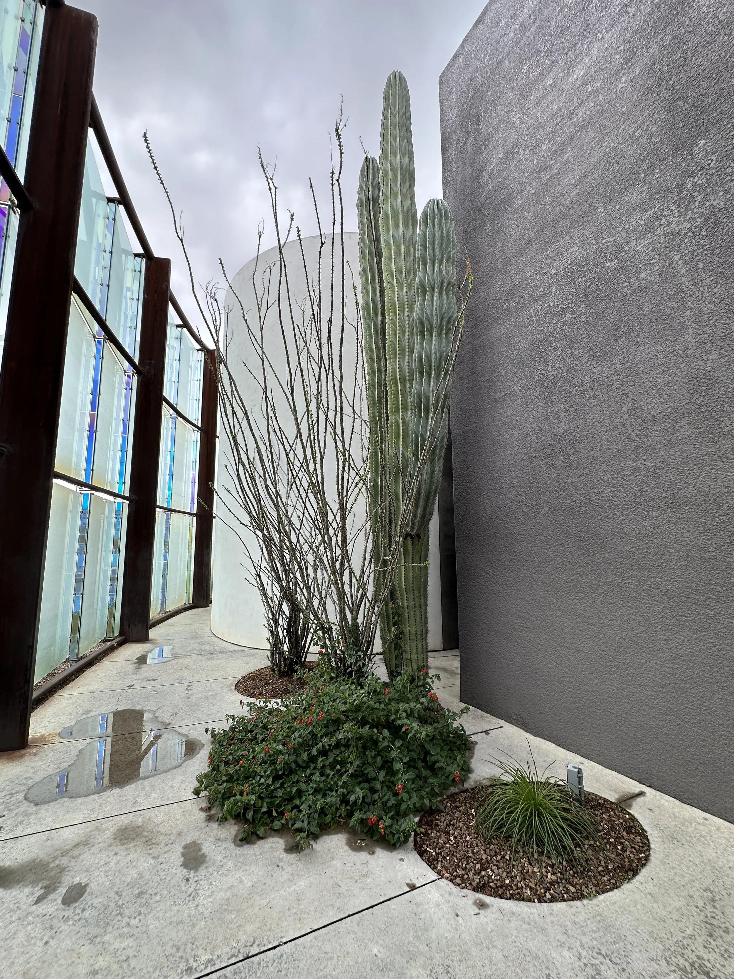 Two more favorite exhibits I sort of discovered by accident. I was looking for a place to down and discovered a covered atrium area on one side of the museum with a beautiful work of art. While relaxing and viewing that I could hear some voices behind a curved wall down the so I went to investigate. I discovered a small circular, concrete room with a built in bench all the way around. There was a friendly guy who was enjoying the space with his adorable dog, who said he and his dog come there frequently. As we were talking, I noticed there was a circular hole in the cone-shaped ceiling, emphasizing the baby blue sky and the puffy white clouds. What a wonderful way to give you a different perspective on the beauty of the sky on an ordinary day!It’s a work of art that changes every minute of every day. I loved it! 😍
