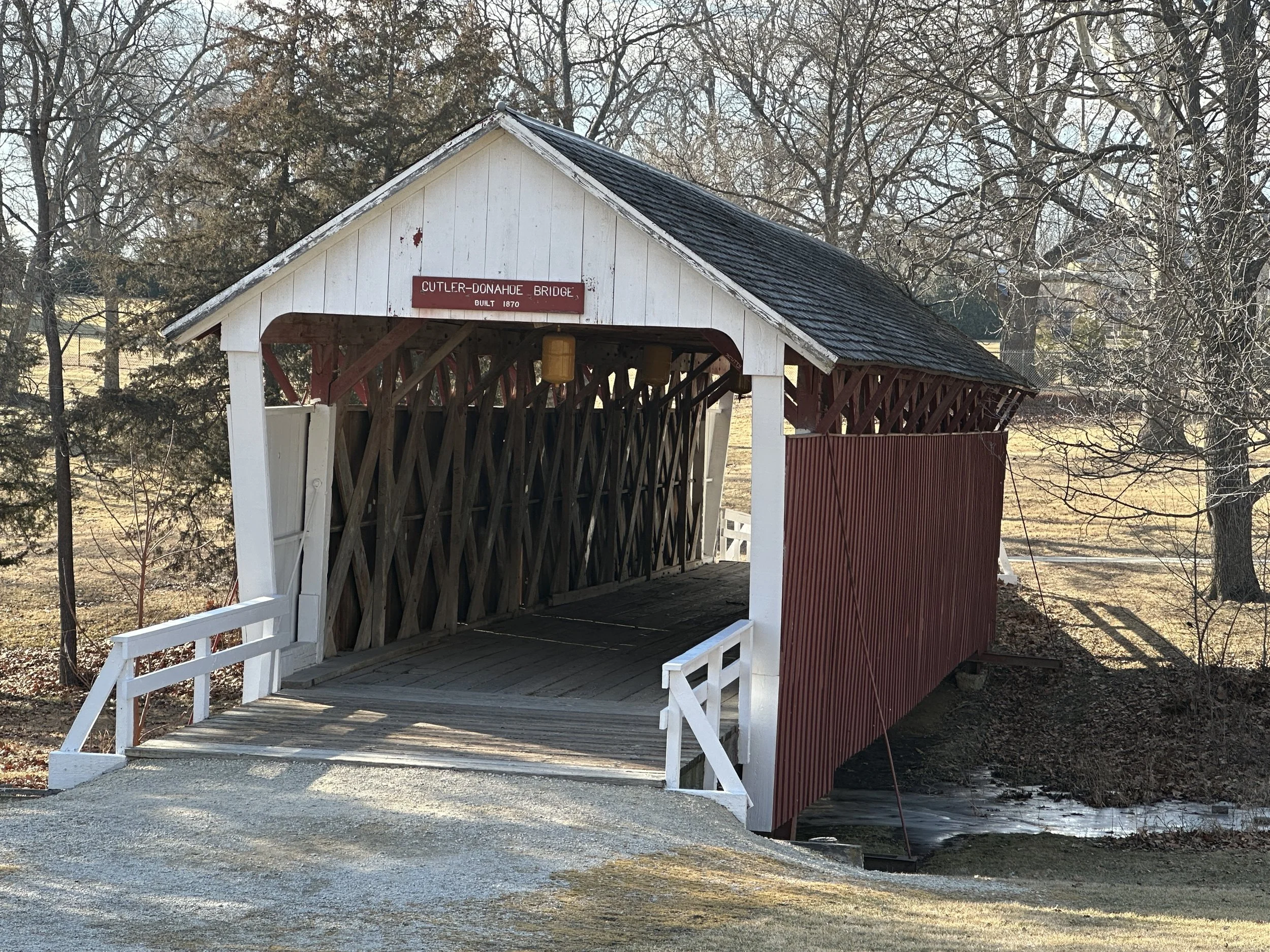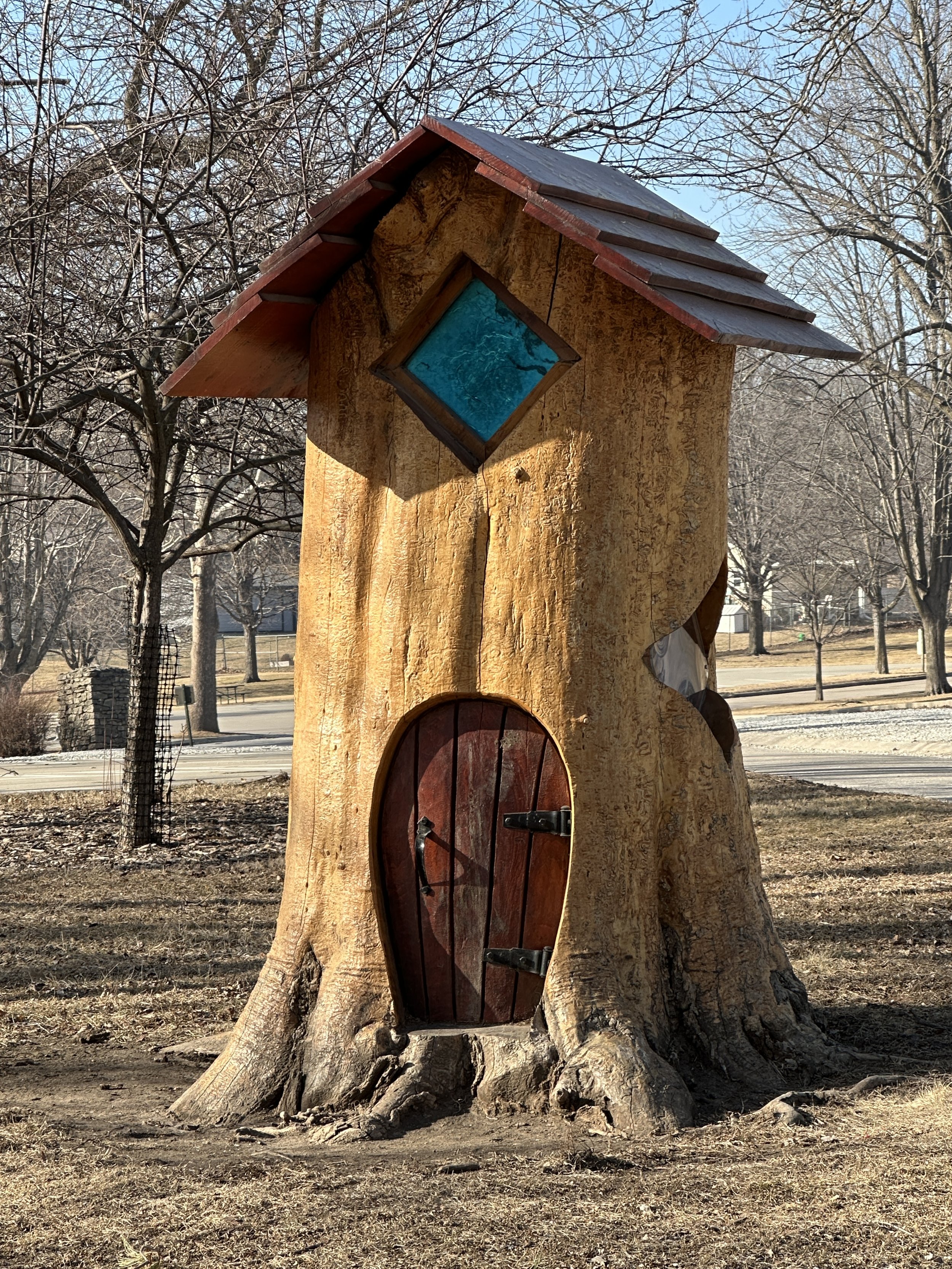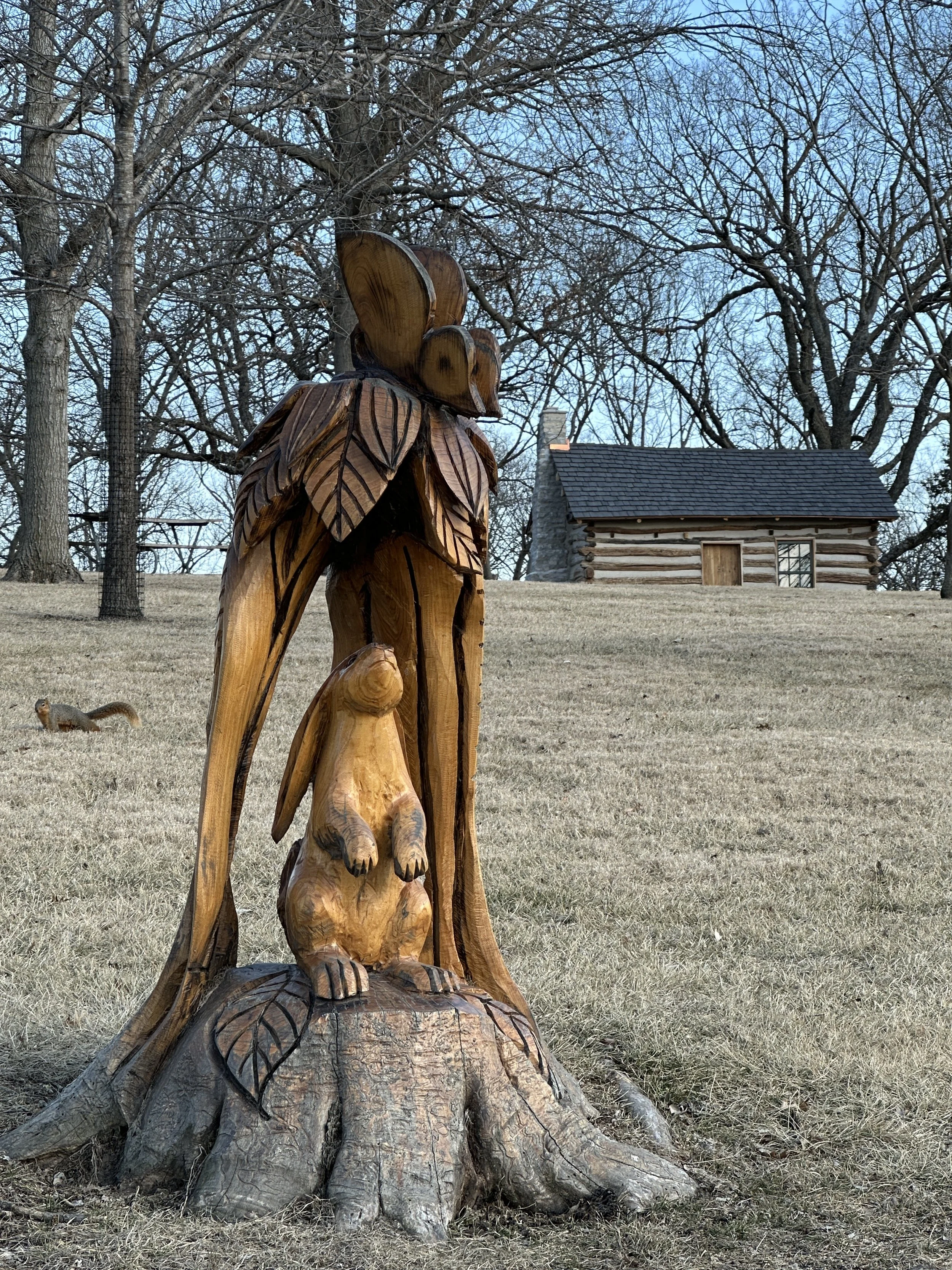 One thing in Winterset that is not to be missed is their City Park. The park has the typical things you might find in a good city park such as updated and inclusive playground equipment and shelter houses for a picnic. It also has numerous fun wood carvings crafted from tree trunks left after a tornado went through several years ago and destroyed the trees. Instead of taking out the trunks, artists carved them into whimsical masterpieces. The most recent masterpiece is a fairy house with stained glass. How fun! Three other unique features round out this park. First, there is a trail, roughly a mile long that you can hike to (and drive to in warmer weather) that takes you to a castle-like tower with beautiful views if you climb to the top. The gate to the tower was closed the day I went but I will go back in warmer weather to experience it myself. Second, there is a covered bridge in the park named the Historic Cutler Donahoe Bridge. It is a small bridge that would be ideal for taking family or group photos. And last, there is a unique log cabin in the park that is interesting to view. All in all, it is a great city park and well worth the time to visit.