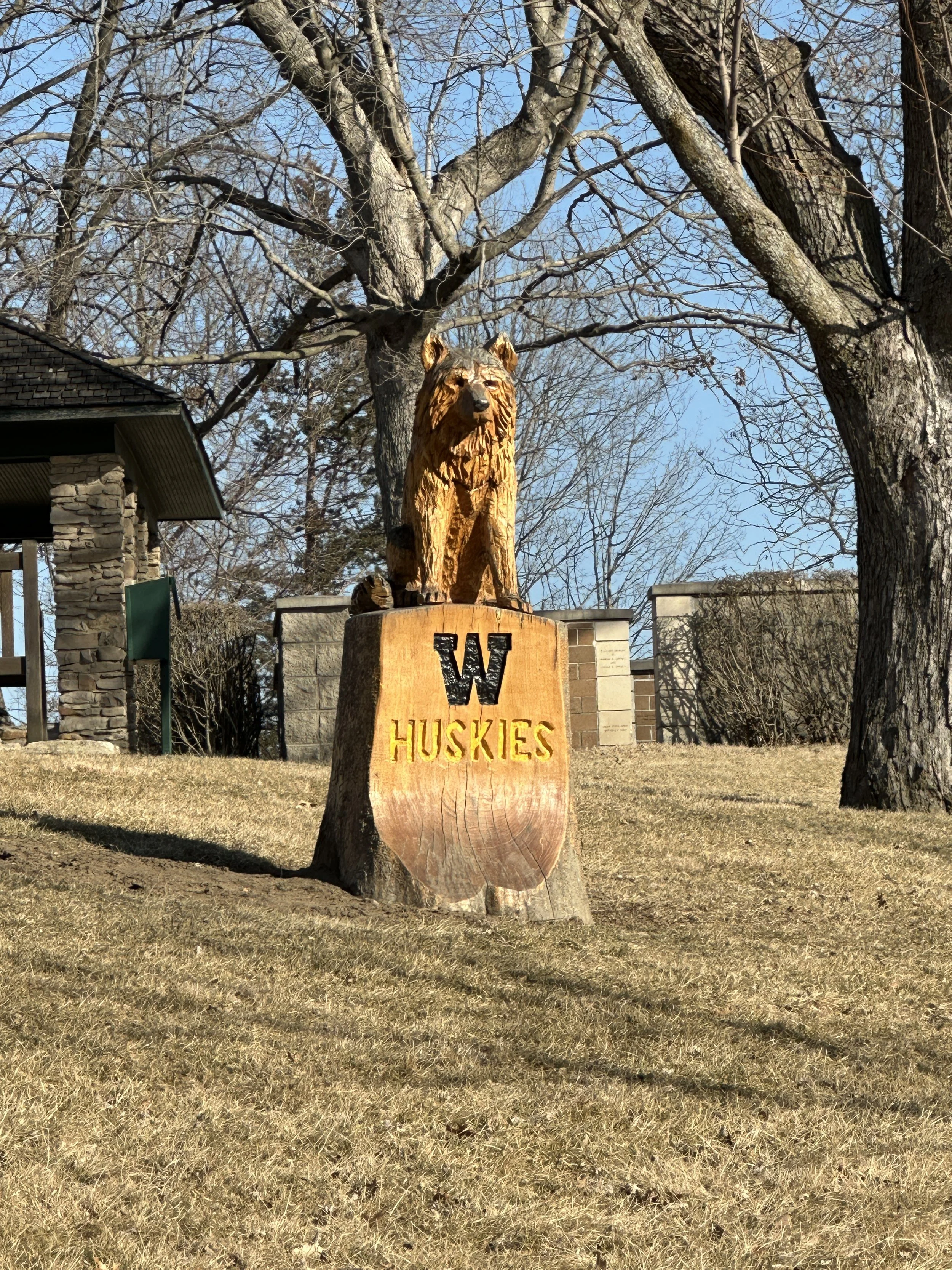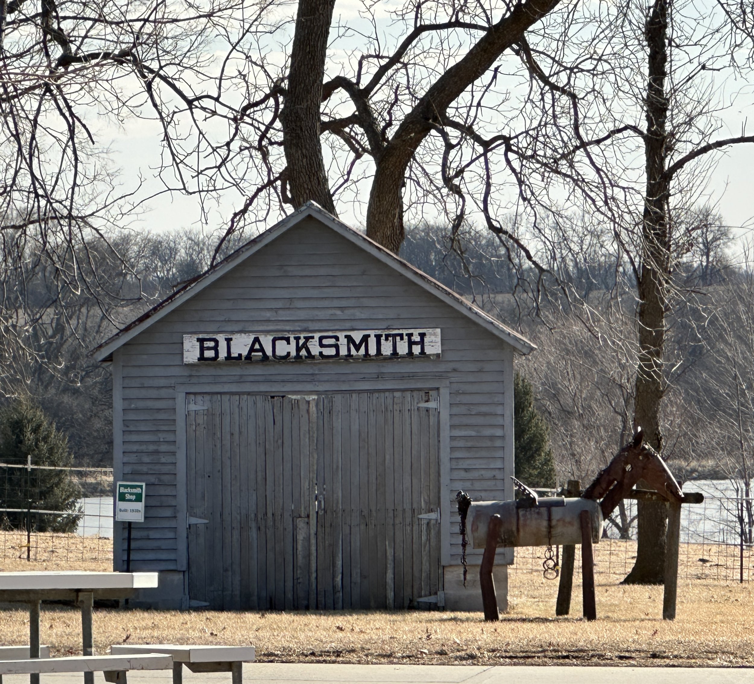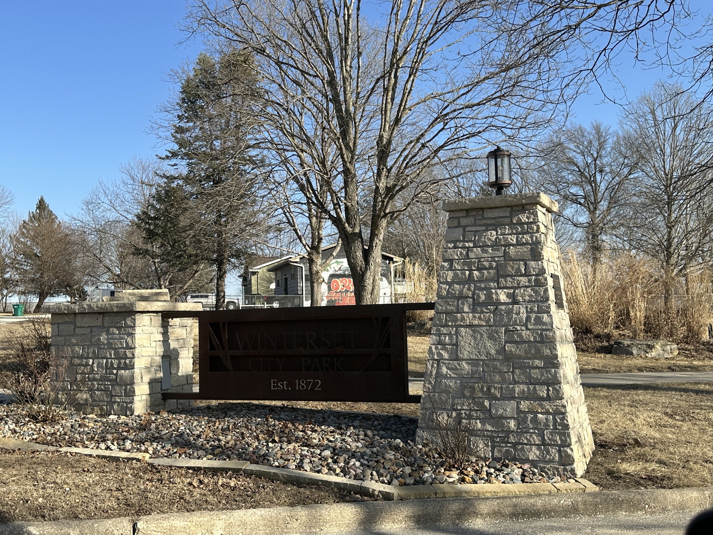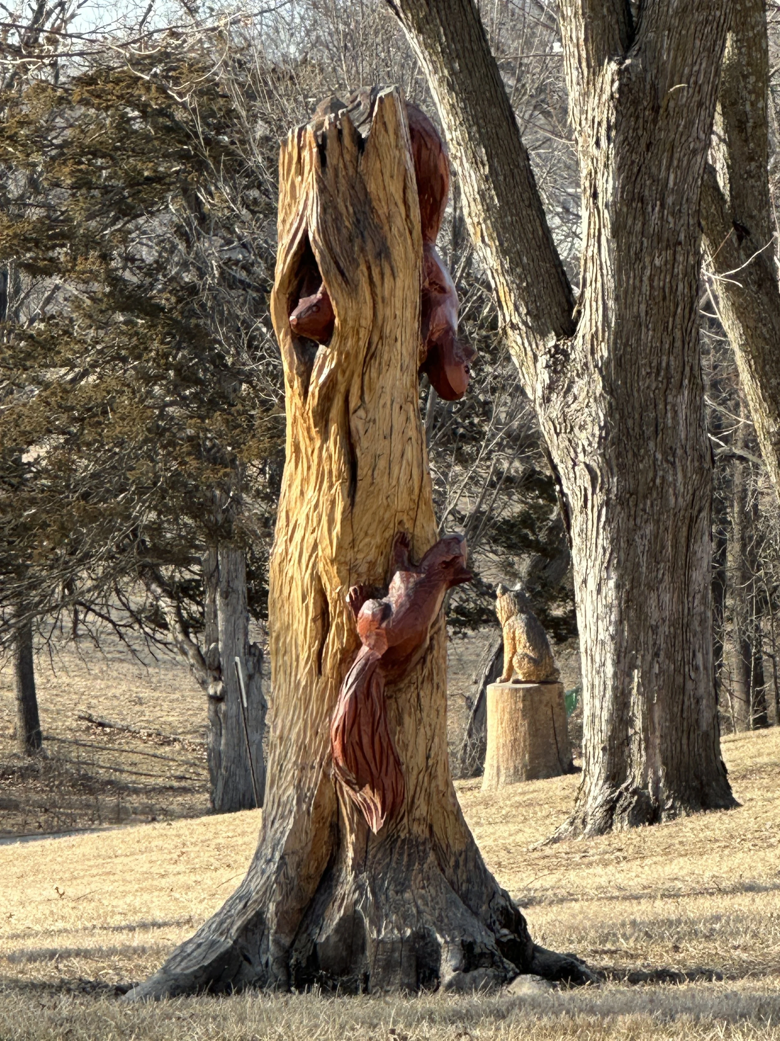 One thing in Winterset that is not to be missed is their City Park. The park has the typical things you might find in a good city park such as updated and inclusive playground equipment and shelter houses for a picnic. It also has numerous fun wood carvings crafted from tree trunks left after a tornado went through several years ago and destroyed the trees. Instead of taking out the trunks, artists carved them into whimsical masterpieces. The most recent masterpiece is a fairy house with stained glass. How fun! Three other unique features round out this park. First, there is a trail, roughly a mile long that you can hike to (and drive to in warmer weather) that takes you to a castle-like tower with beautiful views if you climb to the top. The gate to the tower was closed the day I went but I will go back in warmer weather to experience it myself. Second, there is a covered bridge in the park named the Historic Cutler Donahoe Bridge. It is a small bridge that would be ideal for taking family or group photos. And last, there is a unique log cabin in the park that is interesting to view. All in all, it is a great city park and well worth the time to visit.