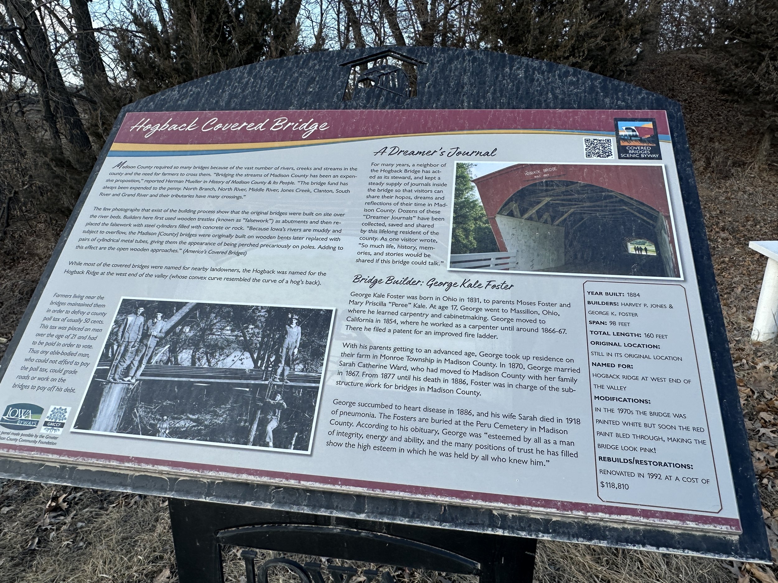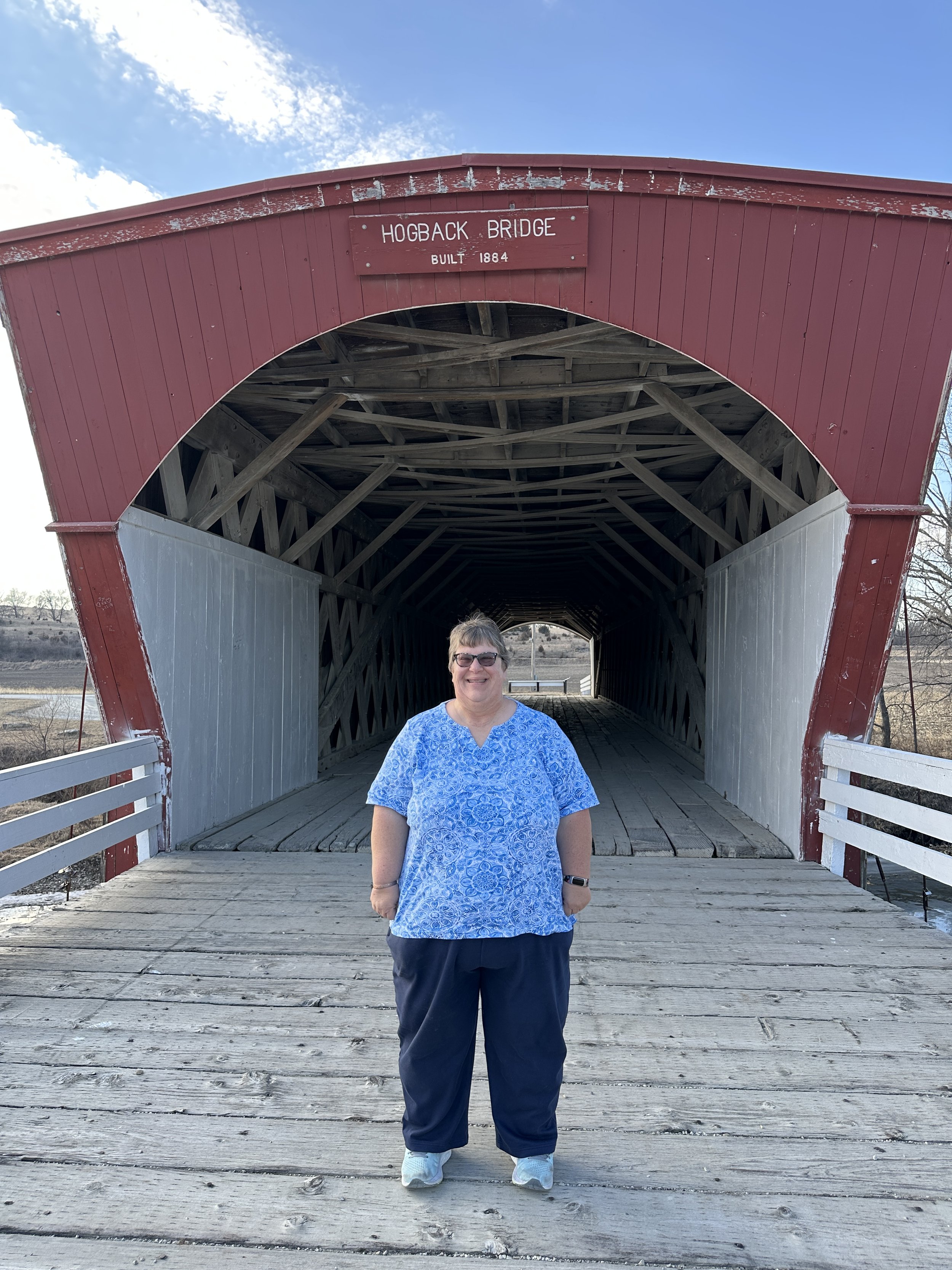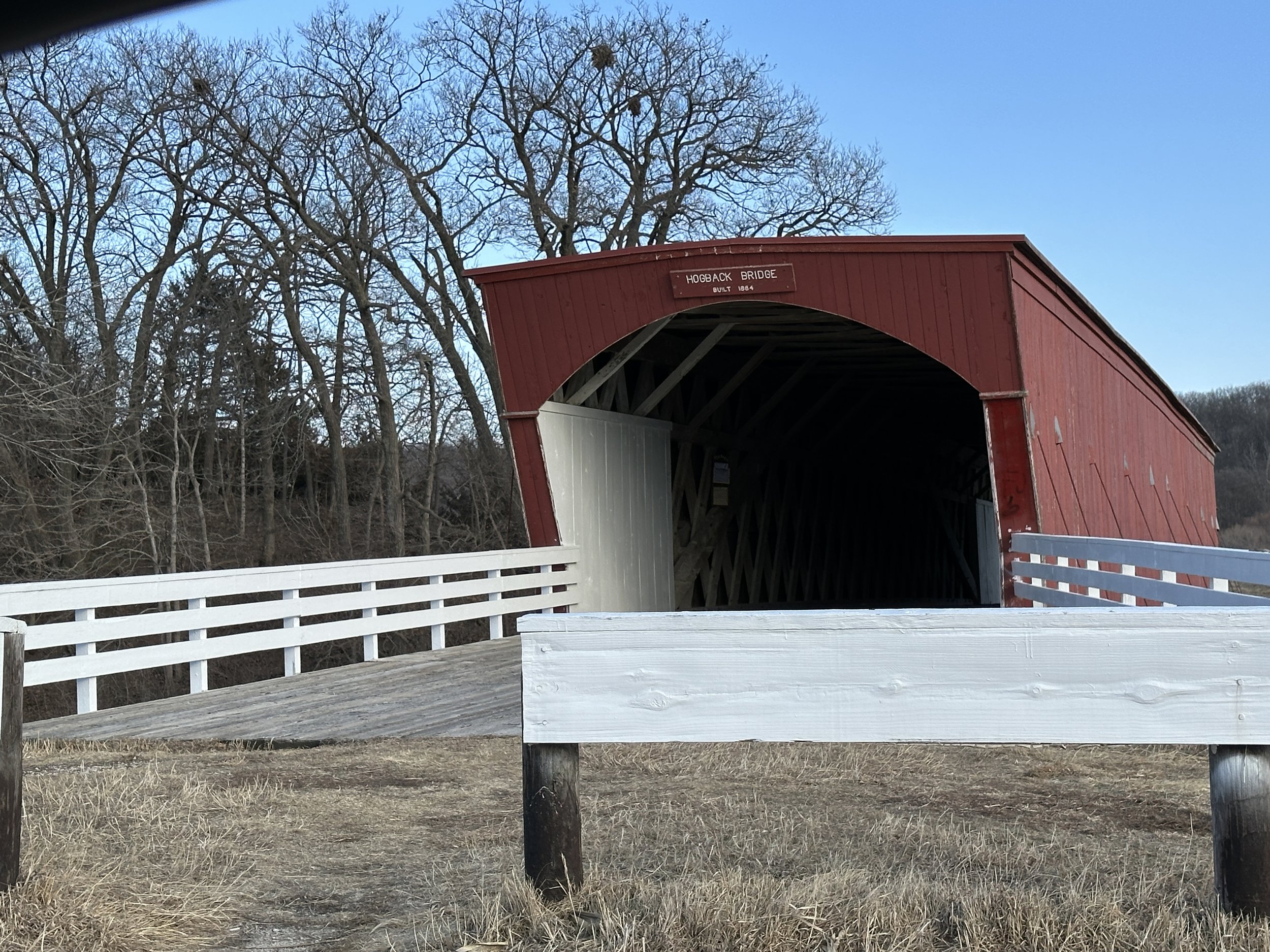 My last stop of the afternoon was a covered bridge about 4 miles outside of town on a gravel road. Touring covered bridges in Winterset/Madison County is almost mandatory. After all, Robert James Waller wrote a famous fiction book about the area aptly called “The Bridges of Madison County.” A movie starring Clint Eastwood and Meryl Streep was later made about it. Ever since then folks from all over the world have ventured to the Winterset area to see its famous covered bridges. I had already been to two bridges, so I chose one a little off the beaten path this time. This bridge was called the Historic Hogback Covered Bridge. It was a beautiful day to view a beautiful bridge and I loved taking photos of it. As a bonus, I met a great couple from the next county away visiting the covered bridges that day too. We took photos of each other and had a fun conversation. That’s another one of the best things about traveling - you meet so many great people!