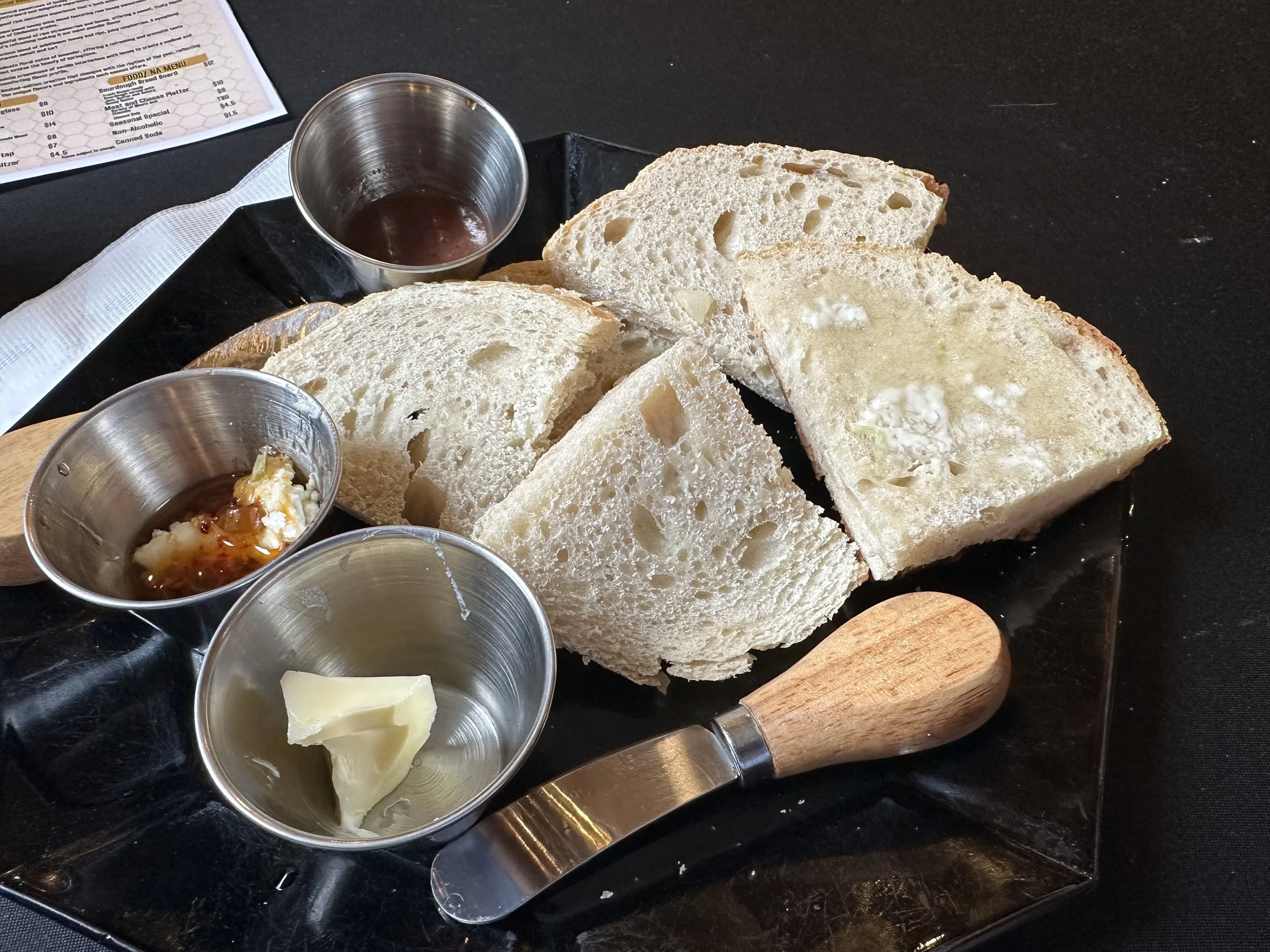 Next I headed across the town square for lunch at a small restaurant called The Honey Lounge. The restaurant was small, but cozy and had a unique offering I was anxious to try - a sourdough bread flight. What is that, you ask? It contained 5 generous pieces of sourdough bread with two different toppings. One topping I chose was a delicious homemade jam. The other spread was a warm, slightly spicy honey topping with feta cheese. While the second option sounds spicy, the honey and feta cheese toned everything down. Both were absolutely delicious, but my favorite was the warm honey spread with feta cheese. And when I ran out of spread for my last piece of bread, they gave me my choice of more. It made for a lovely lunch and would make a great appetizer too. The restaurant also serves different types of mead (sort of like a honey beer) and charcuterie, as well as a daily special. In addition to the restaurant food, there is local honey for sale. I was glad I went, as I always like to try something unique!