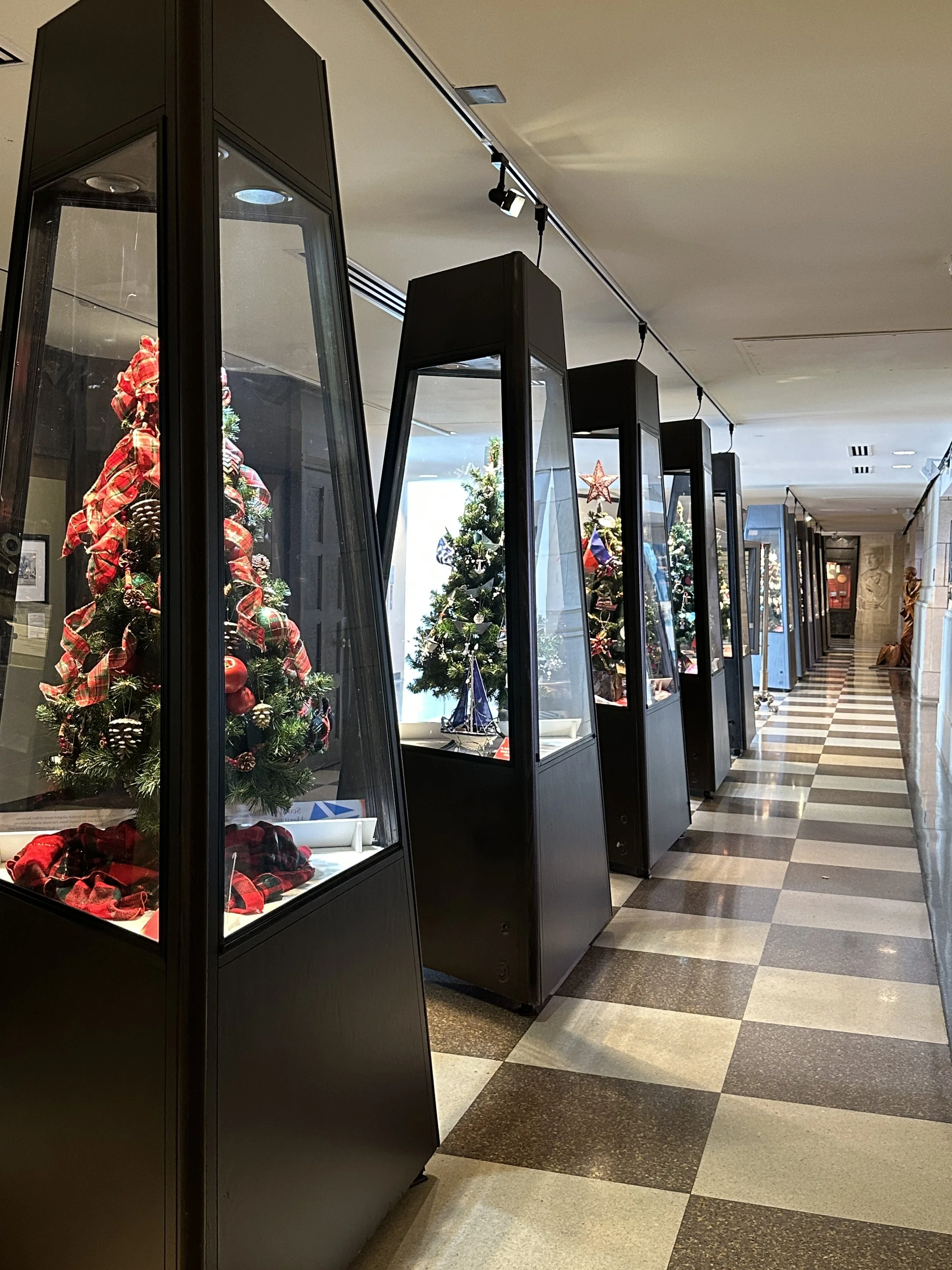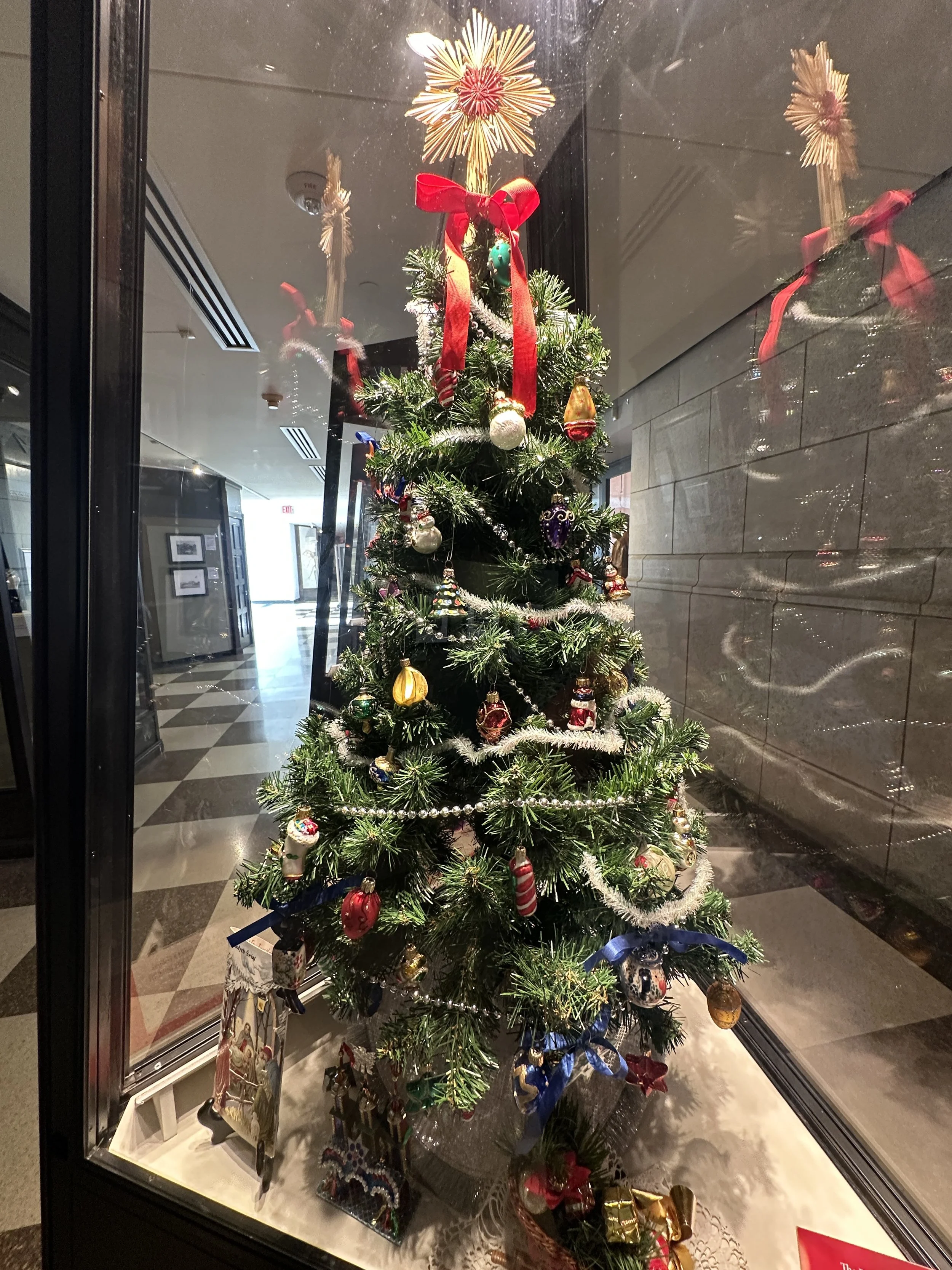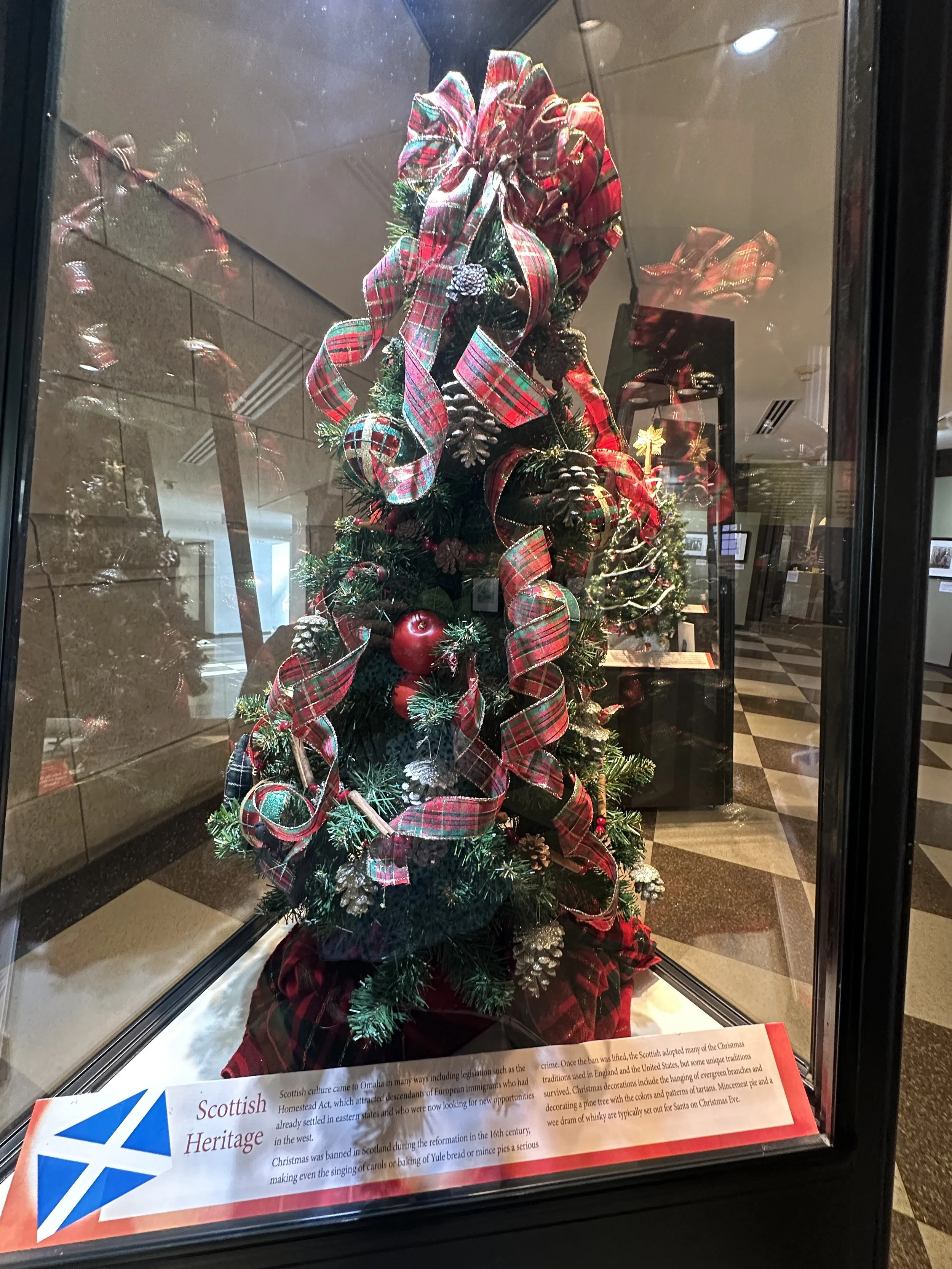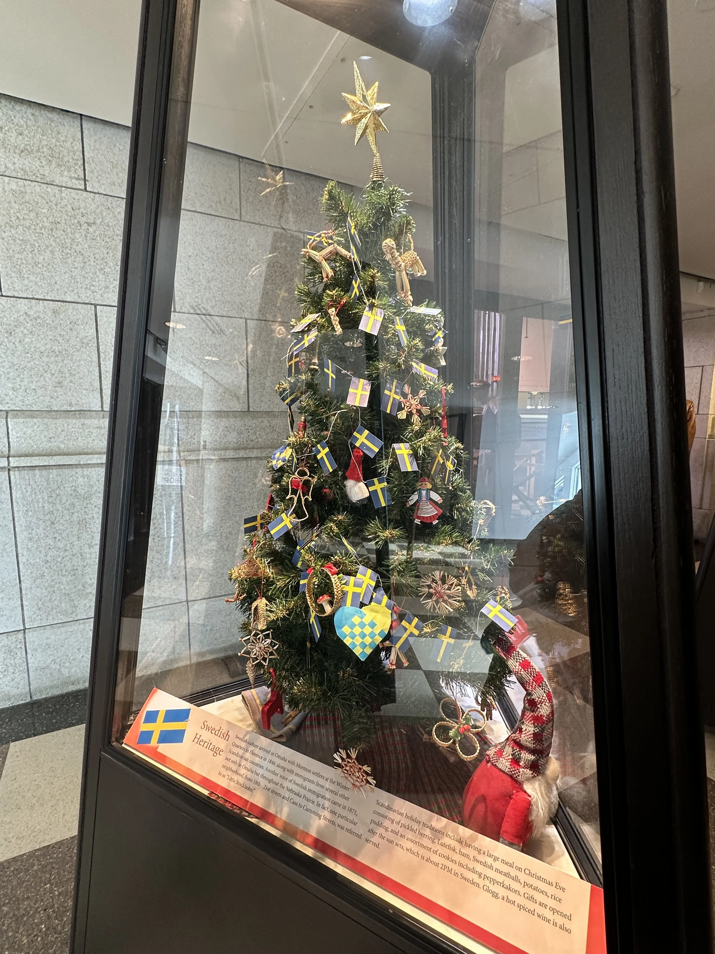 Just off the main hall is a small exhibit room with display cases of small Christmas trees decorated with ornaments of various ethnic groups that have settled in Omaha. It is a wonderful and interesting exhibit. I love seeing the way folks from other countries and ethnicities decorate their trees. A few photos are below.