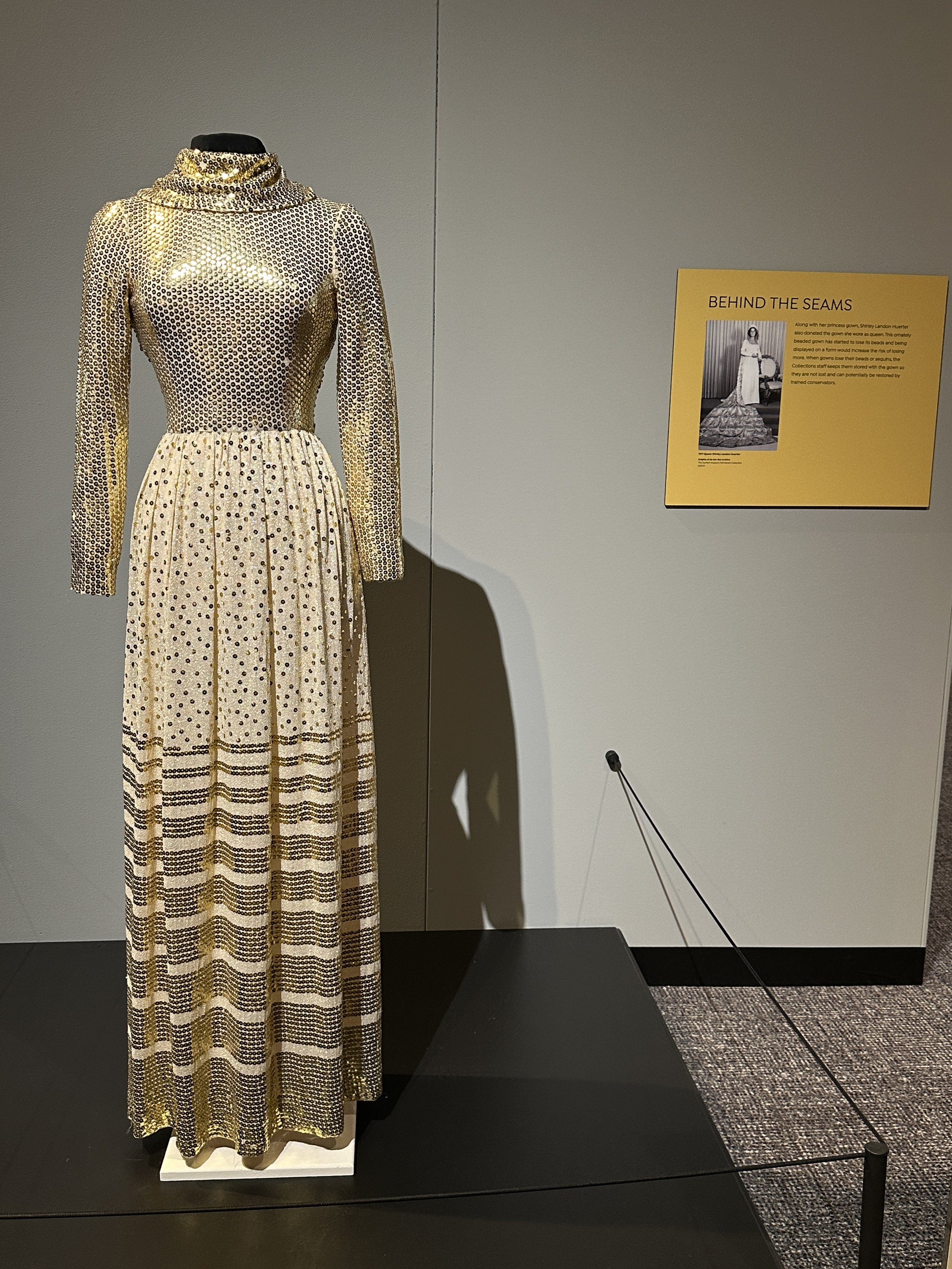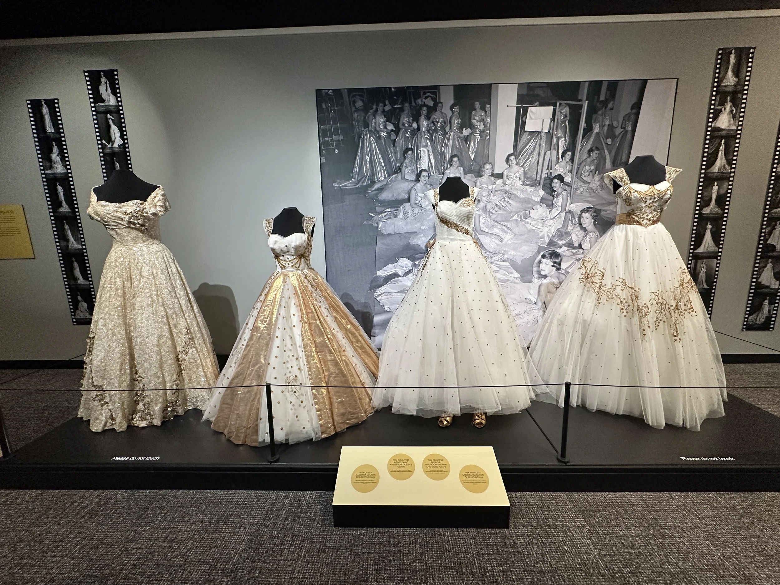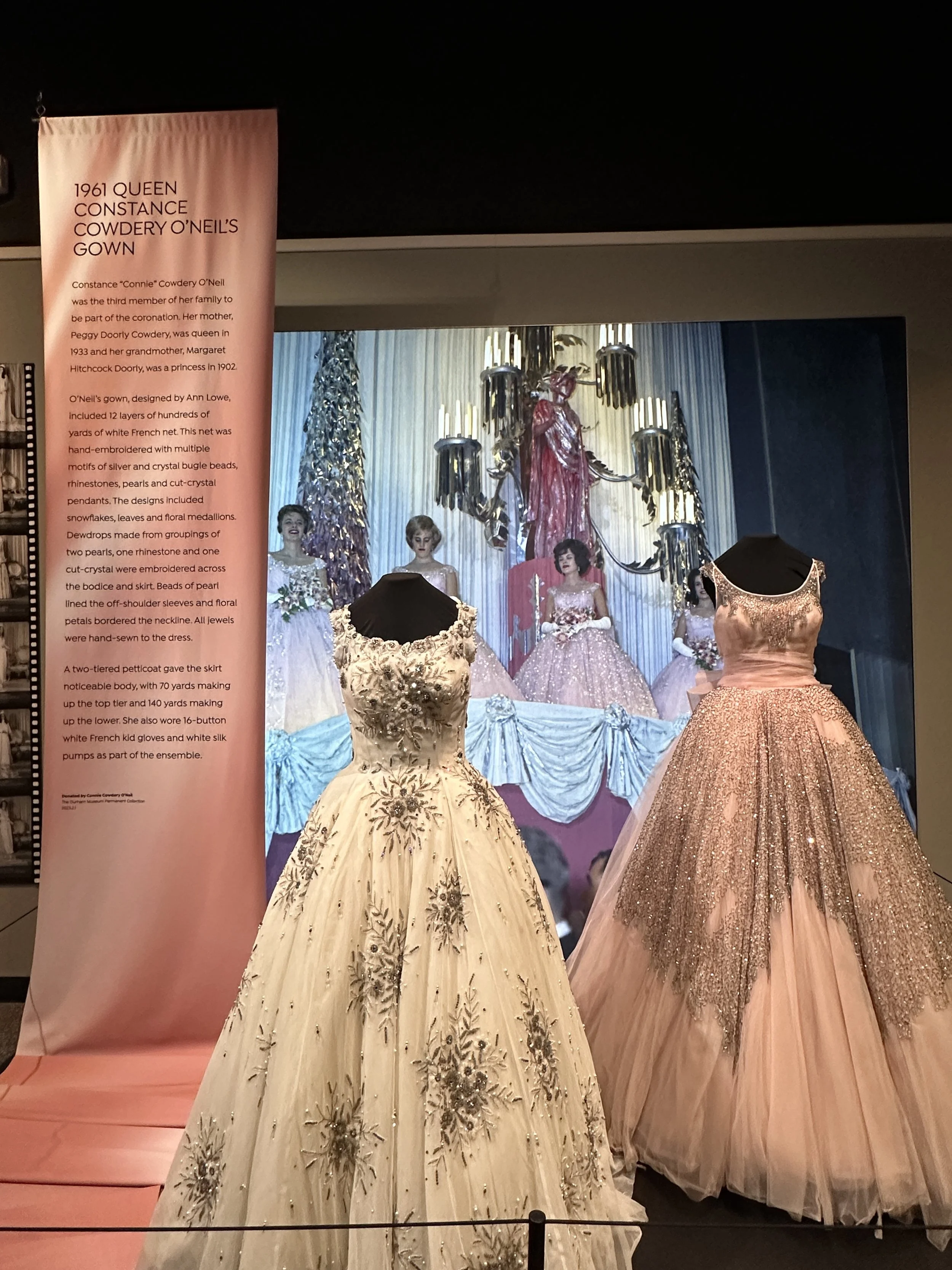 There are three main temporary exhibit spaces on the first floor. In the first temporary exhibit area was a display of dresses entitled, “Woven with History: Timeless Textiles From the Ak-Sar-Ben Collection.” There were several displays of gorgeous gowns from different historical eras from the annual Ak-Sar-Ben coronation ball. The dresses and objects span from the 1910s to the 2010s. This exhibit is available until January 11, 2026. See photos below.